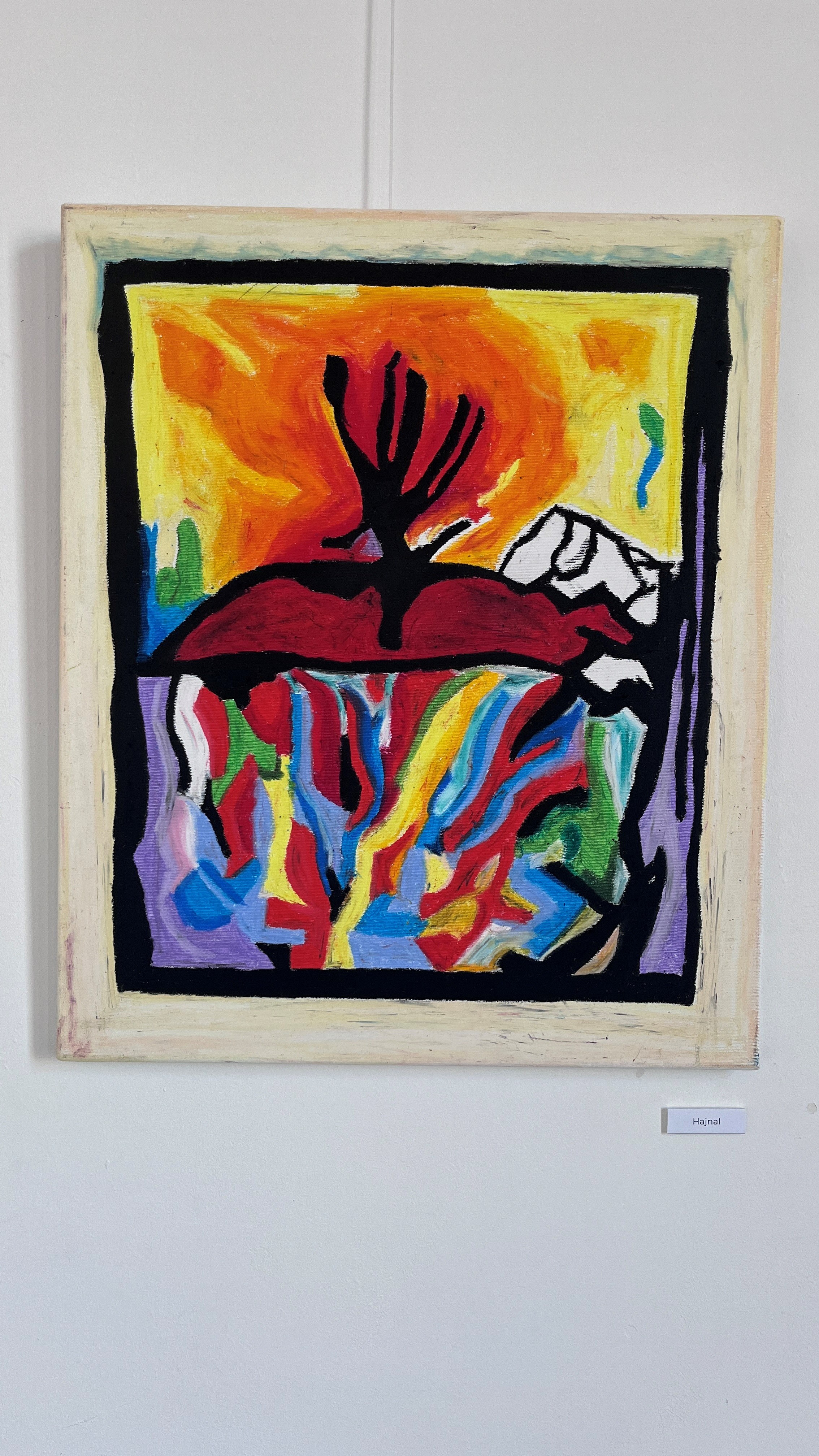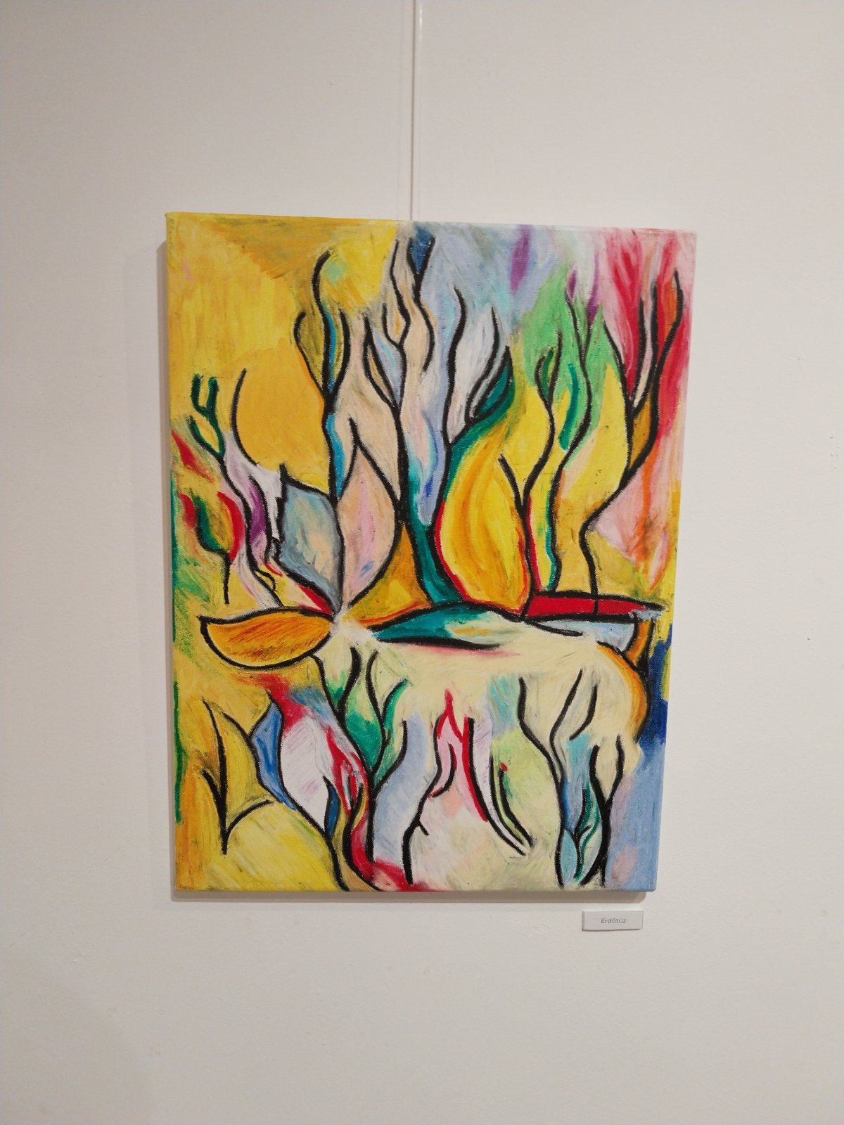 Kata’s artistic journey has deep roots, stretching back many years. Among the most significant influences were the elementary school art classes led by István Sinkó, as well as the summer art camps in Zebegény and Szanticska. As an adult, she focused on oil painting, eventually transitioning to the oil pastel technique that characterizes the works in this exhibition. For those unfamiliar: oil pastels are the distant, let’s say “grown-up” relatives of crayons. This medium is known for its vivid colors and, unlike crayons, allows for color blending and layering. But let’s turn to the exhibited works themselves!