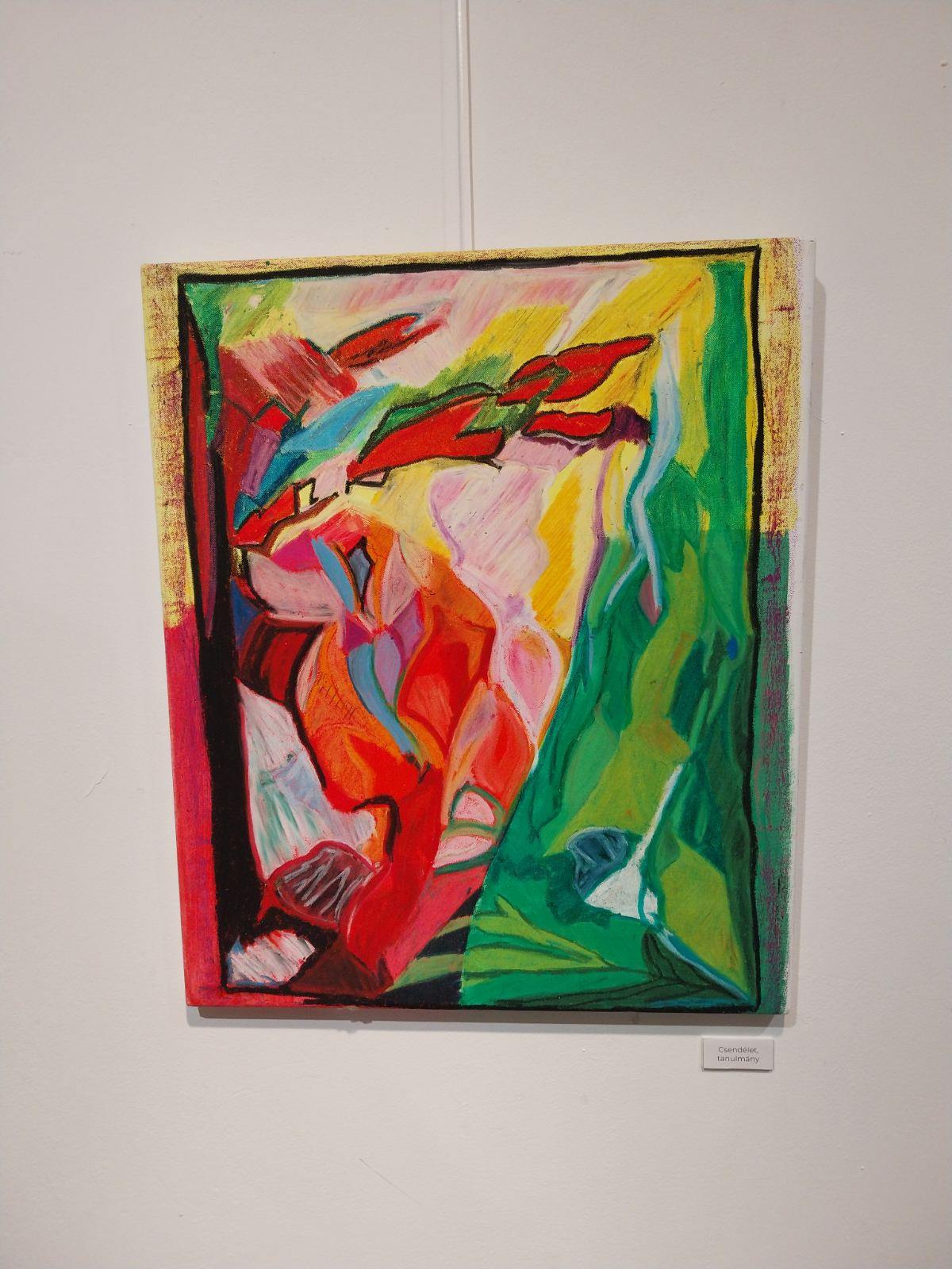 The world of science has a certain characteristic—it doesn’t particularly appreciate when individuals outside its domain attempt to engage in scientific work. Many would not be pleased if, at a scientific event, speakers lacked an understanding of the field’s thought processes and rules of argumentation. However, I dare to believe that the world of art is more open. This is symbolized by the fact that, apart from not being chased away yet, Kata’s paintings have made it to an exhibition—an individual exhibition, no less—without the need for a degree from the Academy of Fine Arts. With persistent work, even as an amateur in the non-pejorative sense of the word, such an achievement is possible. At this point, it is important to acknowledge our gratitude to the Municipality of Budapest’s 13th District and the Angyalföld József Attila Cultural Center for supporting an initiative that provides young local artists with the opportunity to showcase their talent.